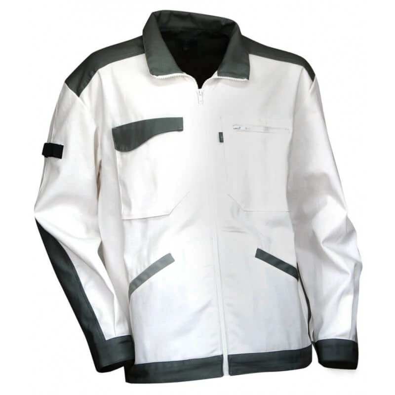 Veste de travail fonctionnelle idéale pour la profession de peintre en batiment. Coloris : Blanc gris Taille 1(XS) – Taille 2(S) – Taille 3(M) – Taille 4(L) – Taille 5(XL) – Taille 6(XXL) Composition : 60% coton 40% polyester 280g/m² Blouson veste de travail blanche modèle 2015 Enduit de marque LMA