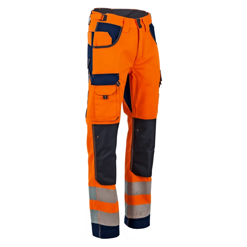 Empiècement renforcés en Oxford 900D imperméable, ceinture ajustable à la taille, emplacement genouillère double position, anneau en D à la ceinture, braguette zip spirale, ceinture gros passant Nombreuses poches dont : 2 poches à grande ouverture, double poche cuisse, 1 poche ticket, 1 poche mètre, 2 poches arrières. Renfort bas de jambes en Oxford Coloris : Jaune fluo/bleu foncé Taille du 38 au 60 Composition : Tissu principal : sergé 54% coton 46% polyester 300g/m² – Empiècements : Sergé 60% coton 40% polyester 280g/m² Vêtements de travail haute visibilité : Pantalon modèle 1679 Polarisation de marque LMA Préconisation d’utilisation classe 2 : Personnes travaillant sur un chantier à proximité des flux de circulation (agents de communes, BTP, chauffeurs cariste …)