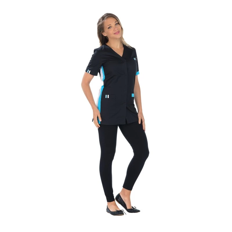 Laissez vous séduire par cette tunique femme 75cm avec fermeture par pressions sous pattes, 2 poches basses, 1 poche BIP, 1 poche poitrine passepoilée, fentes côtés